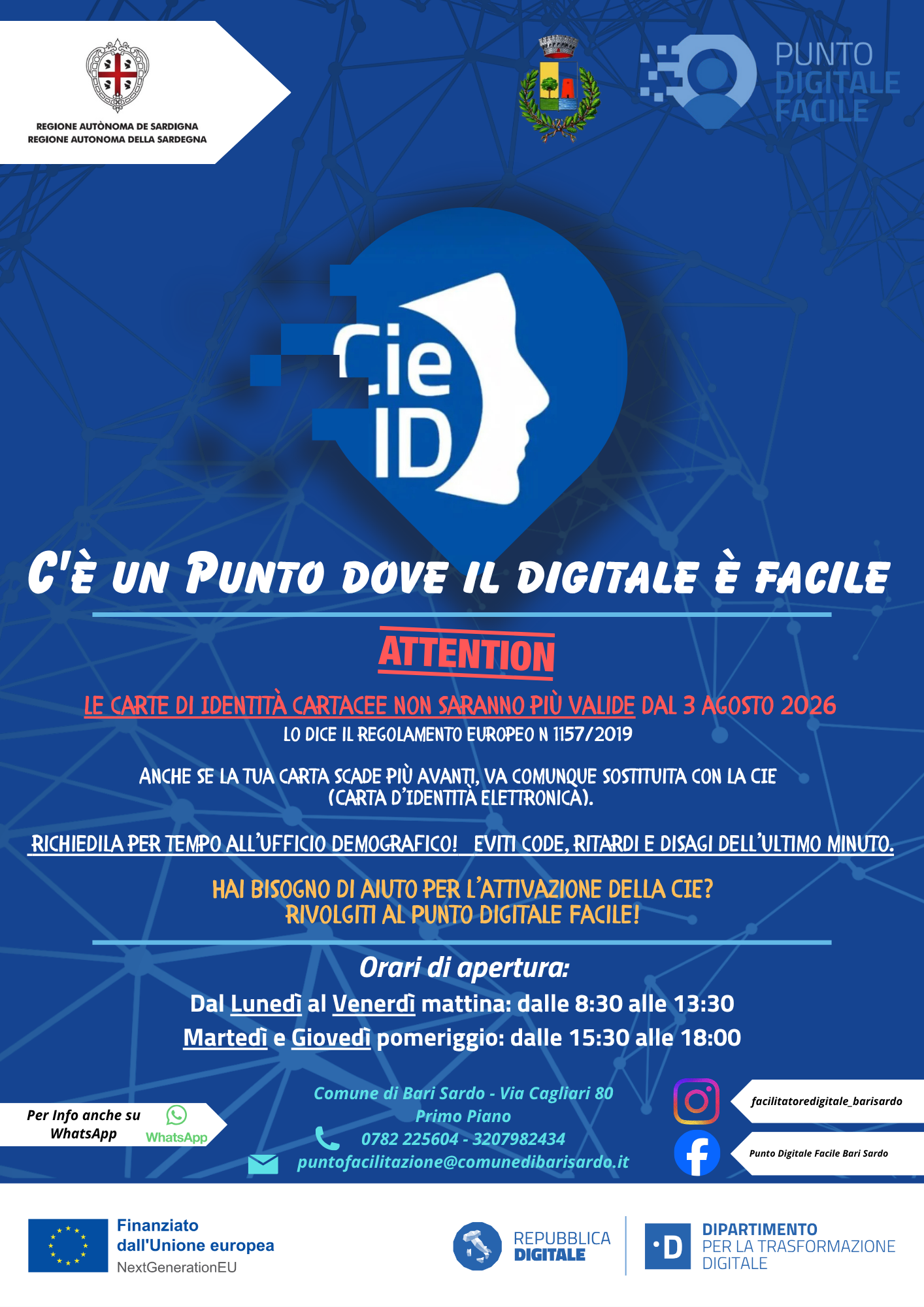 Il Punto di Facilitazione digitale, attivo al primo piano del Comune di Bari Sardo, offre, fra i diversi servizi digitali, anche l’assistenza necessaria per l'attivazione e l'utilizzo della CIE (Carta di Identità Elettronica) per l'utilizzo dei servizi on line della Pubblica Amministrazione.