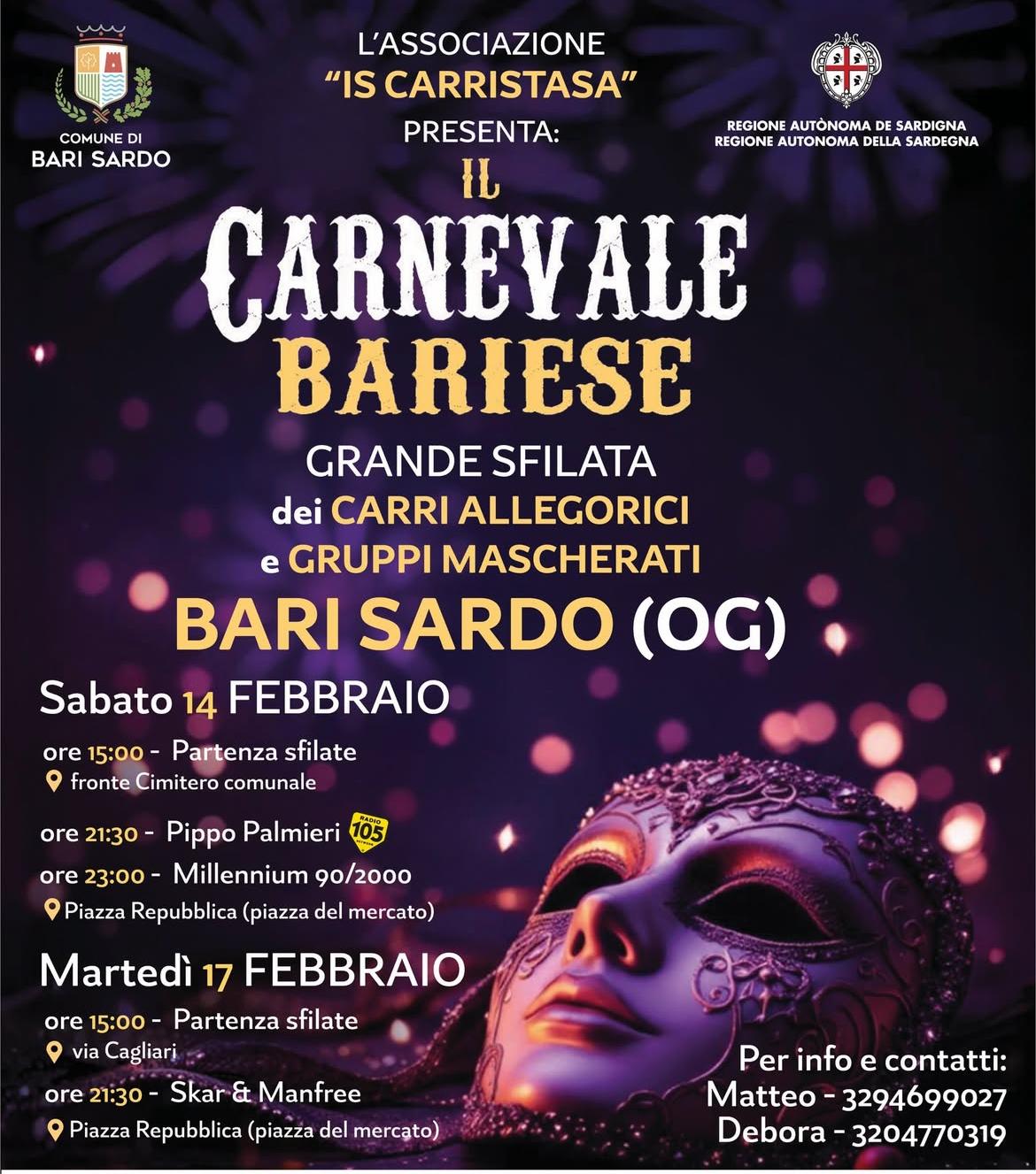 Si comunica che il Comune di Bari Sardo ha provveduto a dettare disposizioni inerenti lo svolgimento delle manifestazioni del Carnevale Bariese, che si svolgerà a Bari Sardo nei giorni 14 e 17 febbraio 2026, al fine di tutelare la sicurezza e la pubblica incolumità dei partecipanti e dei residenti e di assicurare un regolare e sicuro svolgimento delle manifestazioni.