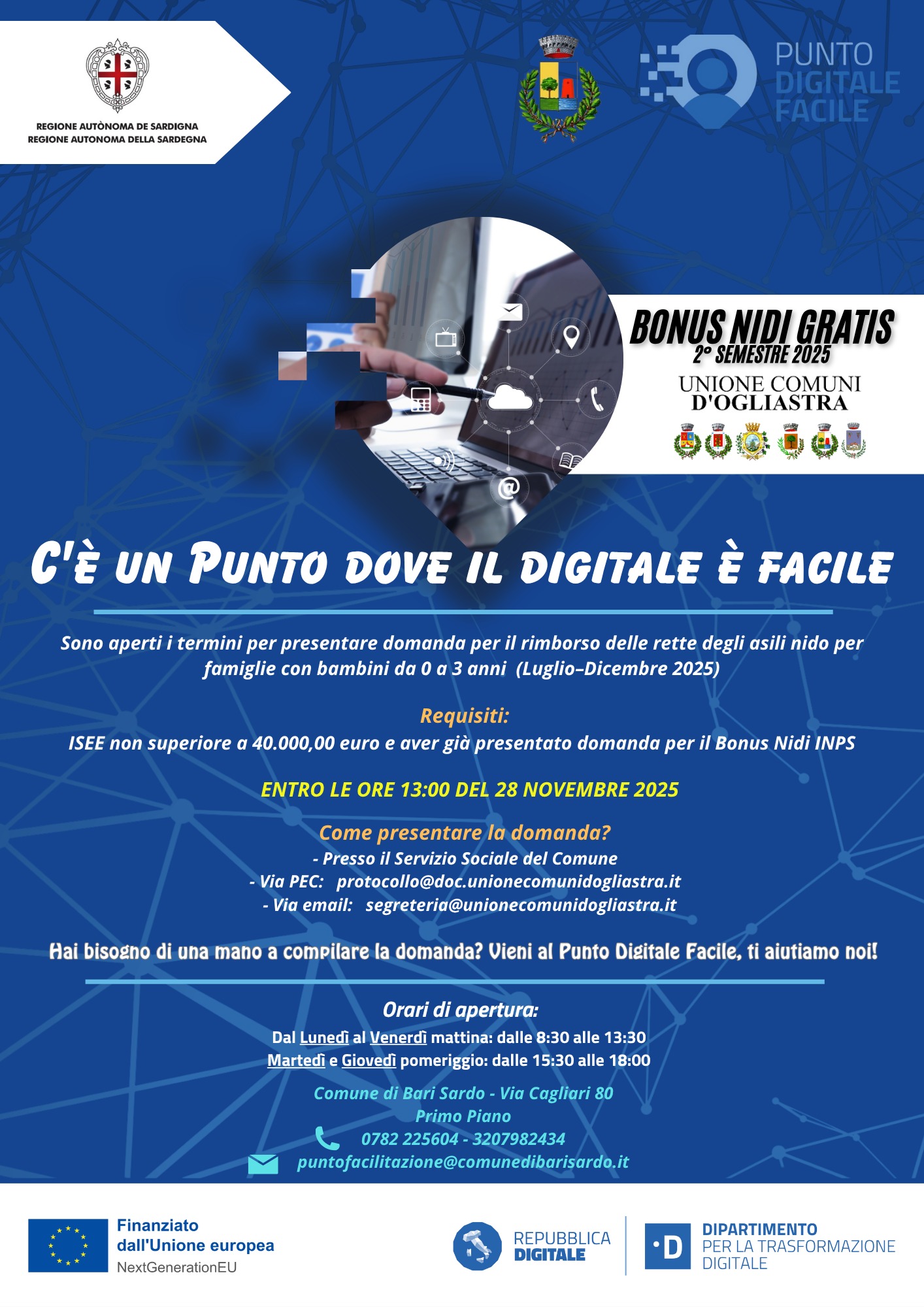 L’Unione dei Comuni d’Ogliastra informa le famiglie interessate che sono aperti i termini per la presentazione delle domande relative al “Bonus Nidi Gratis 2° semestre 2025”