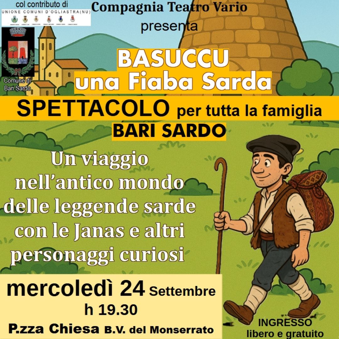 Spettacolo teatrale "BASUCCU, una Fiaba Sarda" mercoledì 24 Settembre 2025, ore 19:30, nella Piazza di Chiesa a Bari Sardo.