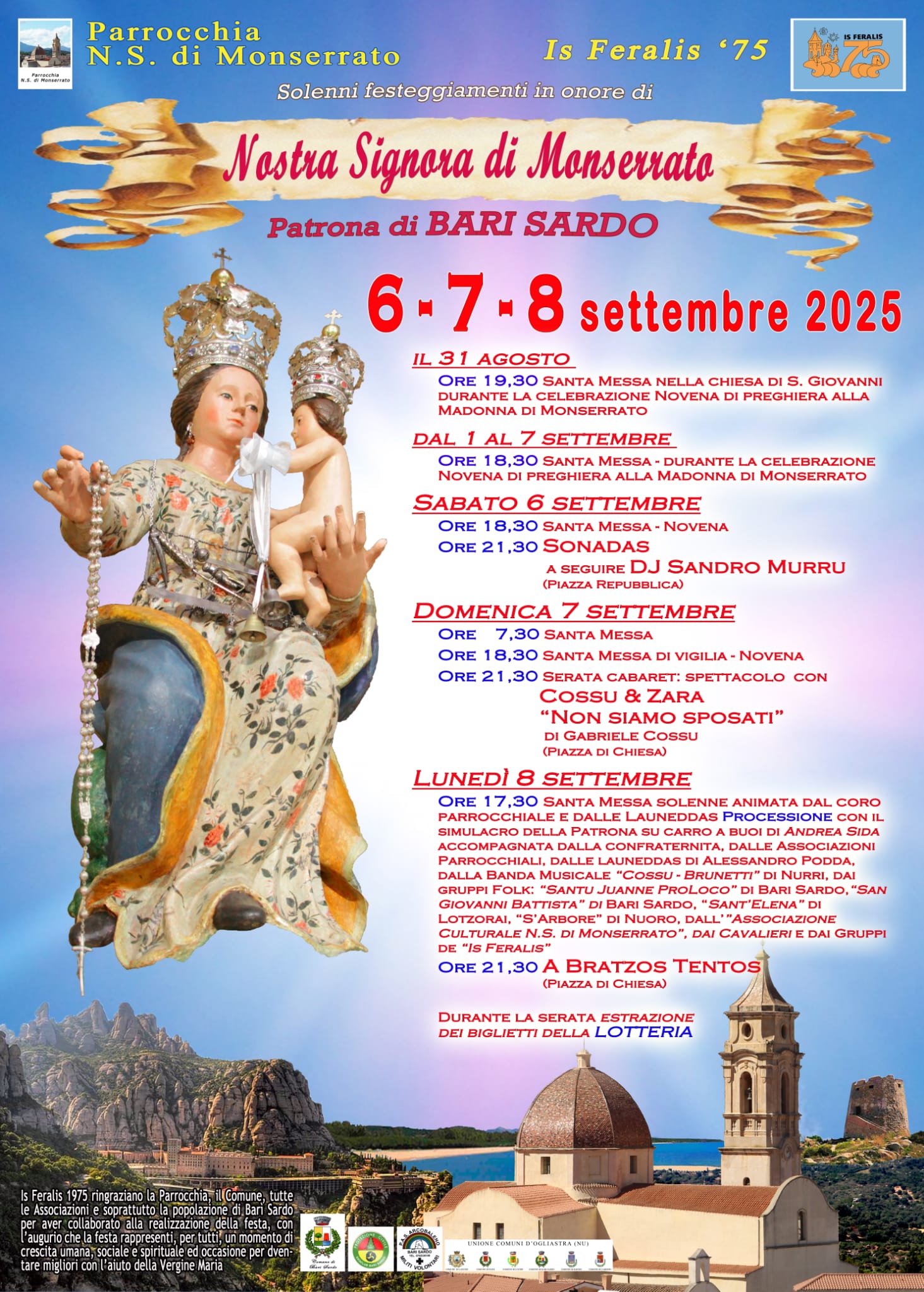 Sarà un programma ricco di eventi civili e religiosi quello previsto per i festeggiamenti in onore della Santa Patrona Nostra Signora di Monserrato, organizzati dal Comitato Is Feralis ’75 con la Parrocchia e il patrocinio del Comune di Bari Sardo.