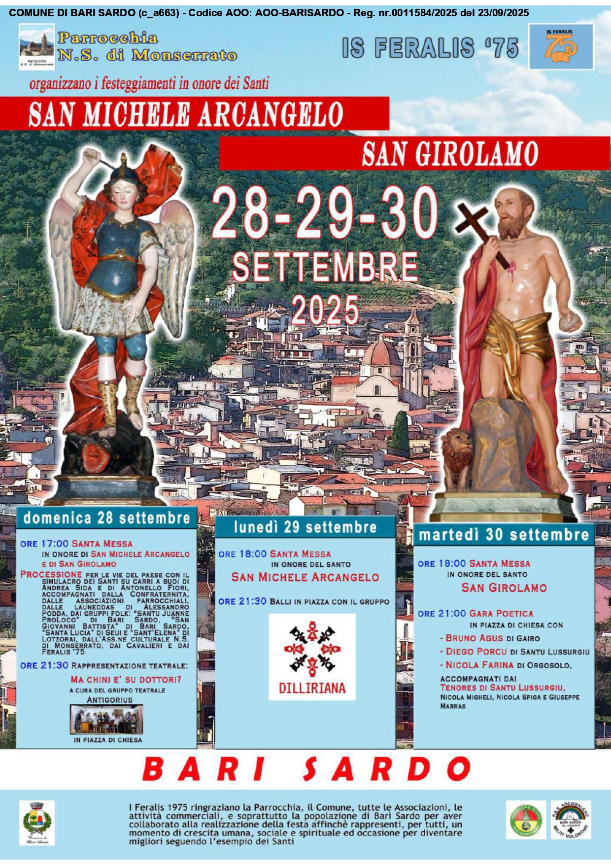 Sarà un programma ricco di eventi civili e religiosi quello previsto per i festeggiamenti in onore di San Michele Arcangelo e di San Girolamo, organizzati dal Comitato Is Feralis ’75 con la Parrocchia e il patrocinio del Comune di Bari Sardo.